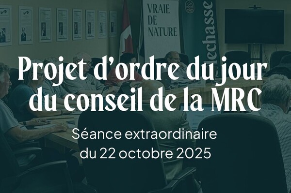 Il y aura une séance extraordinaire du Conseil de la MRC de Bellechasse ce mercredi 22 octobre prochain à 18h30. Les citoyens et citoyennes souhaitant assister à la séance sont les bienvenus.